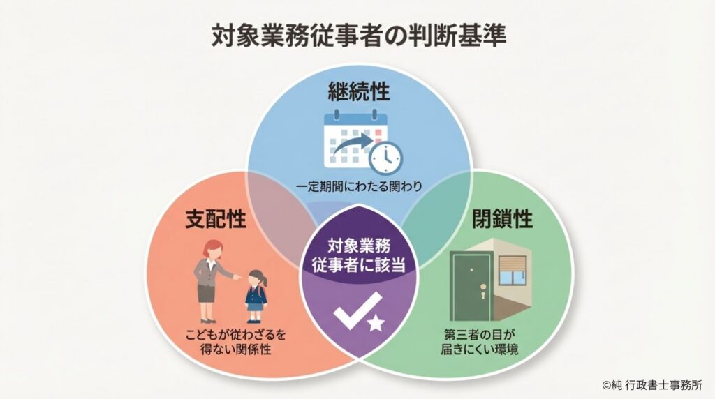 児童等に対して支配性・継続性・閉鎖性を満たす業務であることが必要です。