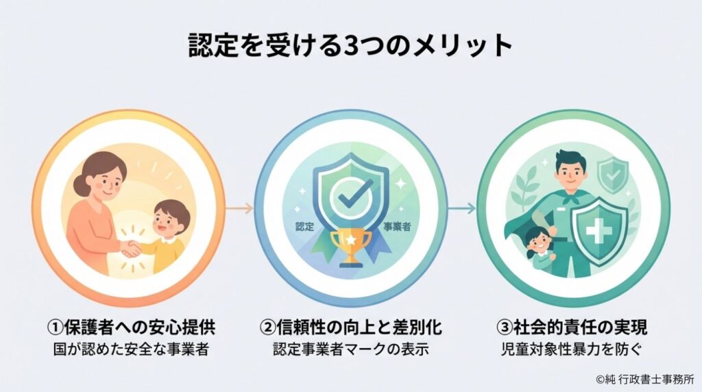 認定を受けるということは、「うちの事業所は、従業員の性犯罪歴を確認し、児童対象性暴力を防ぐ体制をしっかり整えています」と、国から正式に認められることを意味します。