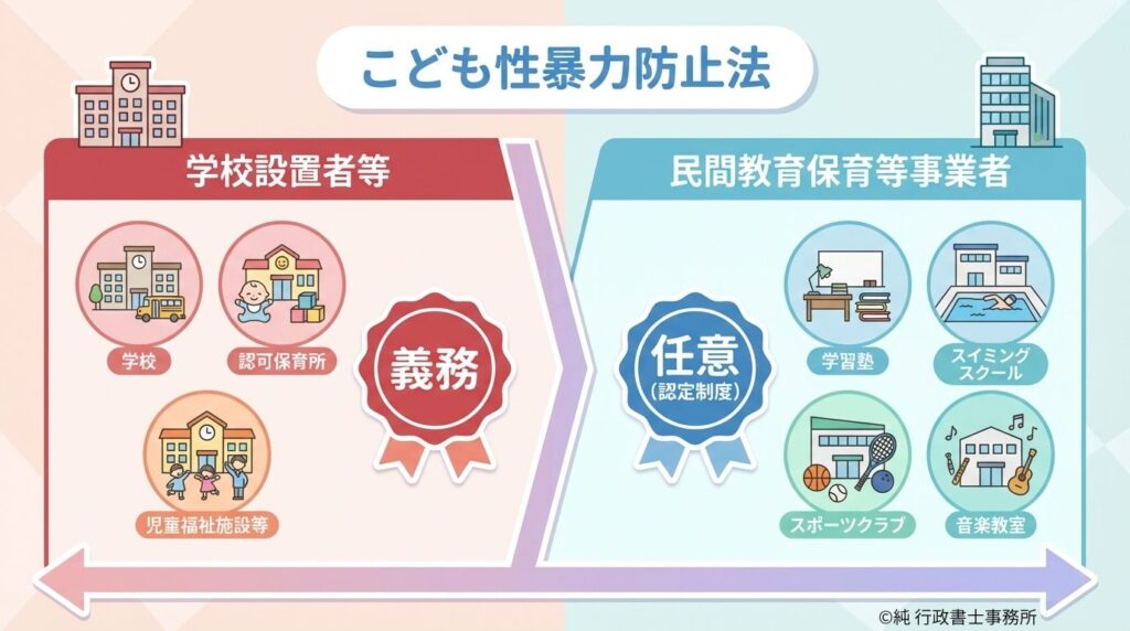 2026年中に施行される「こども性暴力防止法」では、民間の教育・保育事業者が任意で国の認定を受けられる制度が始まります。認定を受けると、保護者の方に「この事業者は児童対象性暴力からこどもを守る体制がしっかりしている」という安心を提供できます。