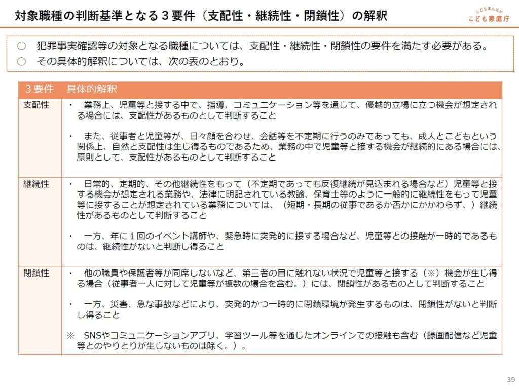 犯罪事実確認の対象になる従事者かどうかは、「支配性・継続性・閉鎖性」の3要件すべてを満たすかどうかで判断します。