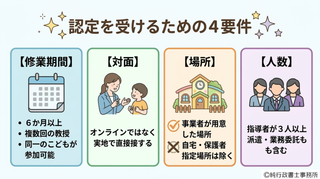 つまり、この4要件は「継続的にこどもと対面で接する実態がある事業かどうか」を確認するためのものです。