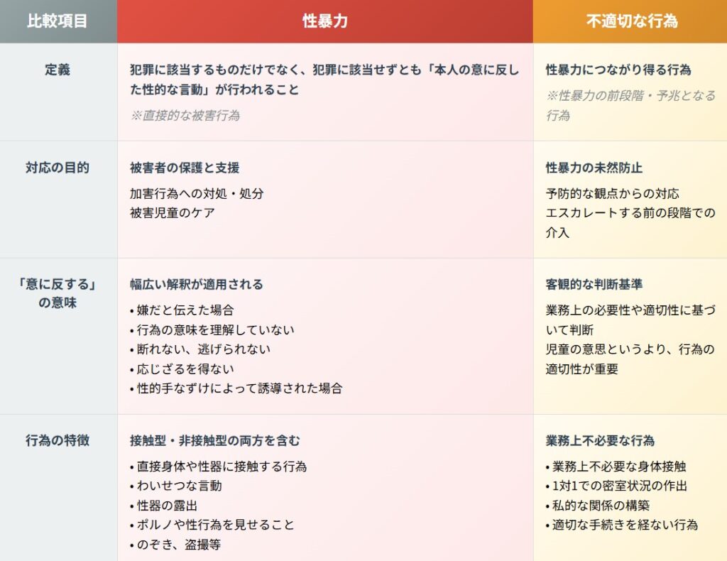 特に重要なのは、横断指針では「性暴力」と「不適切な行為」について明確な定義を示していること。